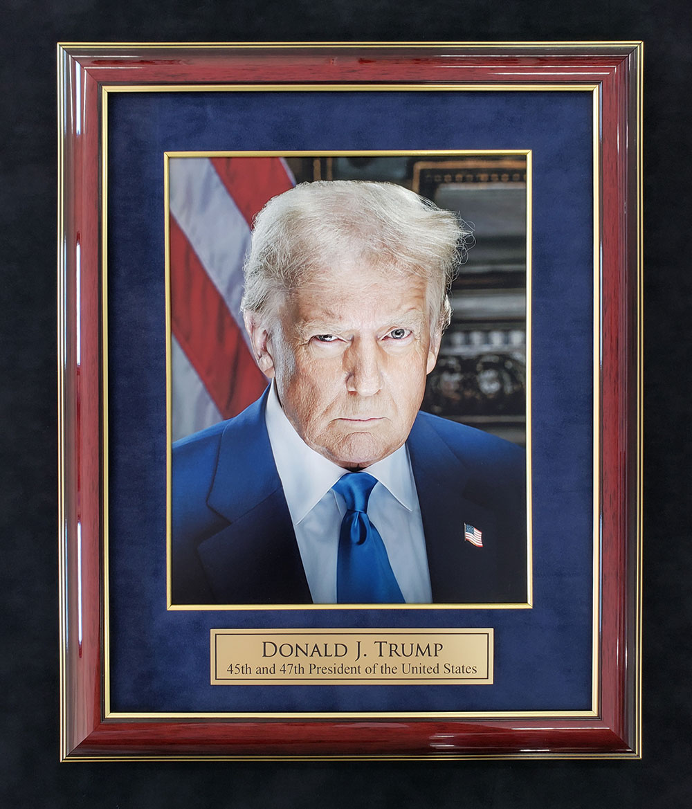 Introducing our exquisite 2025 Presidential Inaugural photo, masterfully framed and ready to grace your home or office. This stunning piece of history features a high-quality image of President Trump, surrounded by elegant suede mats with gold trim accents. A tasteful plaque adds a touch of sophistication, while the gold-trimmed glossy mahogany frame completes the timeless look.